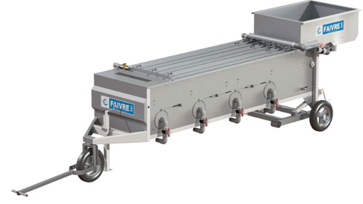 Helios 25, 2 canales. Truchas 5 g – 500 g, 6 salidas. Material SS AISI 304L. Tolva de aluminio. Motor 0,37 kW, 220V 3-PH/60 HZ. Variador de frecuencia. Patas telescópicas y tubos flexibles para cada salida.